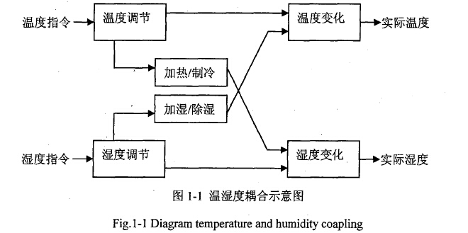 培養(yǎng)箱內(nèi)部氣流循環(huán)控制流程為:培養(yǎng)箱上電后,循環(huán)風(fēng)機(jī)就開(kāi)始運(yùn)行,循環(huán)風(fēng)機(jī)使箱體內(nèi)的氣流不停的流動(dòng),使箱體中的氣流**終達(dá)到相同的溫度和濕度。但培養(yǎng)箱是一種非線性禍合滯后系統(tǒng),控制很容易超調(diào),且溫濕度超過(guò)設(shè)定值后很難降下來(lái)。培養(yǎng)箱溫濕度藕合模型簡(jiǎn)圖如圖1一1所示。目前復(fù)雜非線性藕合及滯后系統(tǒng)完善有效控制策略的缺乏,導(dǎo)致這類系統(tǒng)的實(shí)時(shí)有效控制存在很大困難,常規(guī)的控制方法通常很難達(dá)到要求,無(wú)法為生命科學(xué)實(shí)驗(yàn)提供穩(wěn)定可靠的環(huán)境條件。