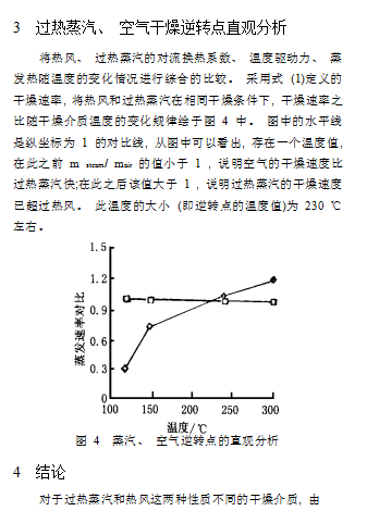 于其基本熱力學(xué)特性的不同, 在不同的蒸發(fā)溫度下會(huì)反映出不同的蒸發(fā)速率變化規(guī)律。 考慮恒速干燥段, 在較低的介質(zhì)溫度下, 熱風(fēng)干燥時(shí)物料表面溫度和介質(zhì)的溫度差比過熱蒸汽大許多, 使得在較低溫度時(shí) , 熱風(fēng)的干燥速度比過熱蒸汽要快;隨著溫度的升高, 這種溫差大所占比例優(yōu)勢(shì)明顯下降;過熱蒸汽的對(duì)流換熱系數(shù)隨溫度的升高較熱風(fēng)增長(zhǎng)得要快, 抵償了溫差小的劣勢(shì) ;而蒸發(fā)單位水分需用的熱量, 過熱蒸汽比同樣條件下的熱風(fēng)所需的熱量要小。正是這三方面的結(jié)合使得逆轉(zhuǎn)點(diǎn)存在。